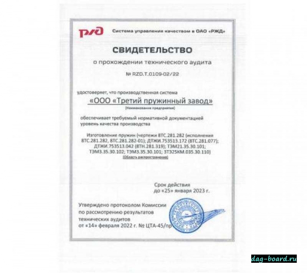Компания ООО «Третий пружинный завод» специализируется на производстве пружин сжатия, для тепловозов, локомотивов и другой железнодорожной техники. Наше предприятие работает на рынке с 2018 года. Наличие собственной производственной базы позволяет изготавливать и хранить запасные части для заказчиков, а также отгружать любым видом транспорта в короткие сроки и в удобное для заказчика время. Являясь производителем, наше предприятие гарантирует высокое качество продукции на изготавливаемые изделия. Мы являемся поставщиком запасных пружин сжатия, для железных дорог Российской Федерации и ближнего зарубежья. Наша производственная база, квалифицированные специалисты и оборудование позволяют предприятию изготавливать продукцию по чертежам заказчика. Система менеджмента качества нашего предприятия сертифицирована и соответствует требованиям международного стандарта ISO 9001: 2015, что позволяет обеспечивать требуемое качество продукции. Основные виды продукции: Пружины: чeртеж 8ТС. 281. 282 чертeж 8Т